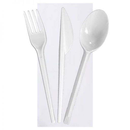 Bis di posate imbustate in plastica bianche da 17 cm Bis di posate riutilizzabili in plastica Bianca con certificato di conformità. Posate imbustat...