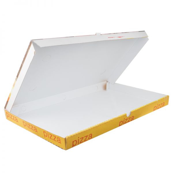 Pizza boxes are boxes suitable for transporting pizza wherever you want without them losing their fragrance or running the risk of getting ruined or getting cold. The take-away pizza boxes are white in color and the prints on the boxes may be subject to variation depending on stock availability.