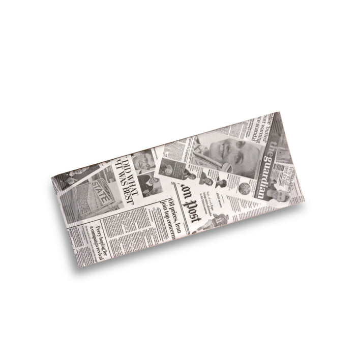 Enveloppes porte-couverts blanches avec imprimé journal. Dimensions 10×25 cm.