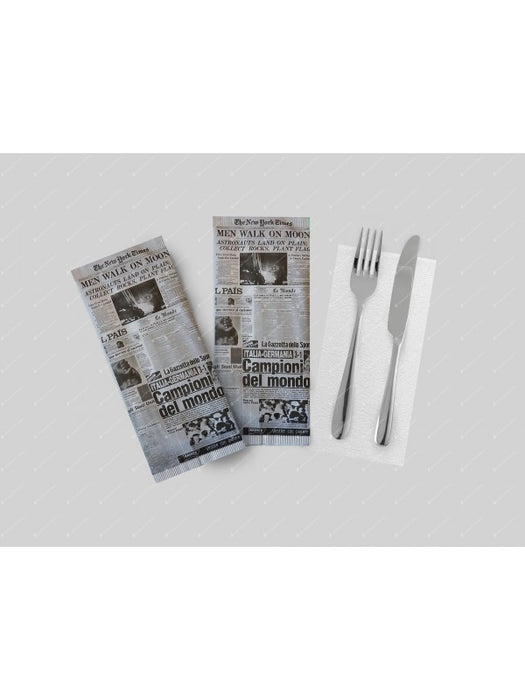 Les sacs à couverts sont fabriqués en papier blanc imprimé journal et à l'intérieur se trouve une serviette double épaisseur mesurant 38 x 38 centimètres.