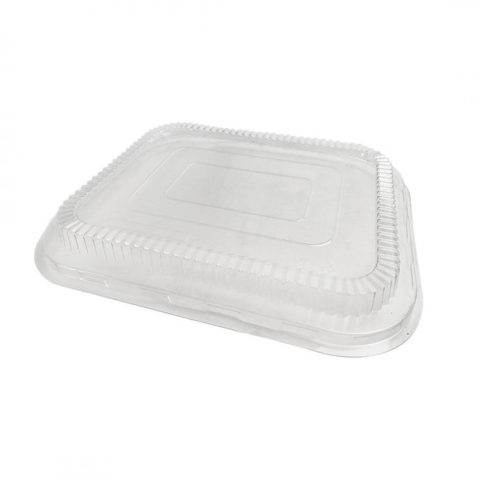 Couvercle PET transparent pour barquettes 4 portions Eclipse en aluminium laqué , dimensions 24,3 x 18,9 cm et hauteur 2,7 cm. Le couvercle en PET est adapté au contact avec des aliments chauds et présente des lignes décoratives sur le bord qui rendent les barquettes plus esthétiques. Ils sont disponibles en paquets de 50 pièces.