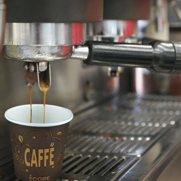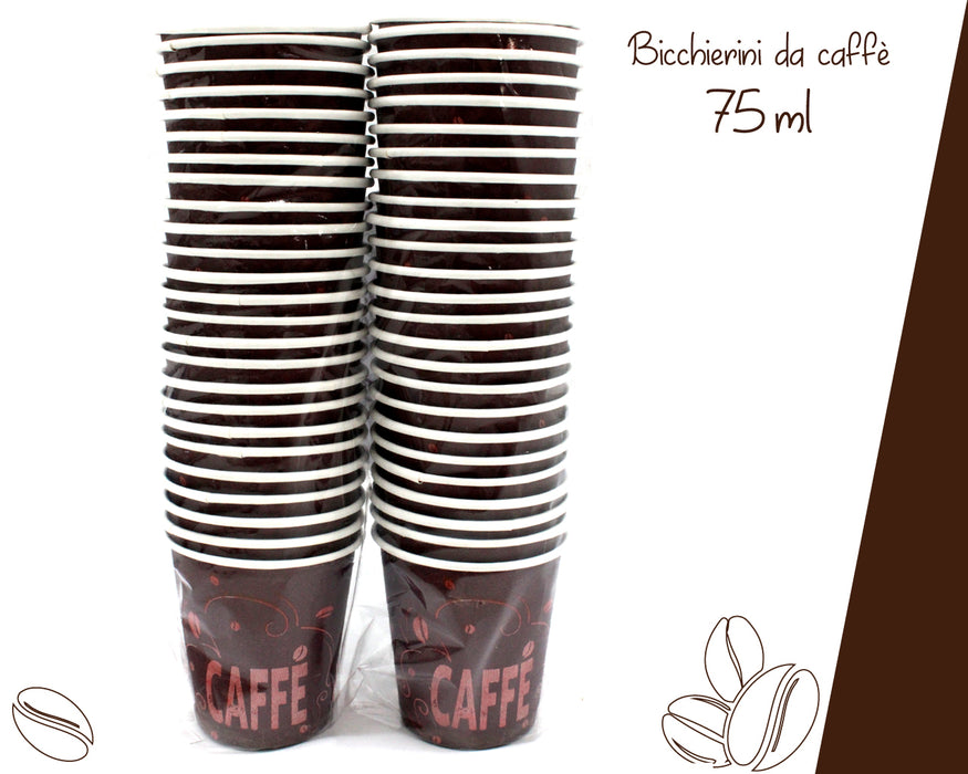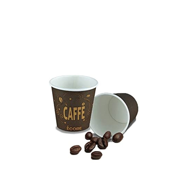I bicchieri da 75ml in carta, di colore Avana con Grafica Ecore Caffè monouso, sono realizzati in cartoncino di pura cellulosa di altissima qualità accoppiato a caldo con un sottile film in PLA, adatti per bevande calde ma anche fredde.