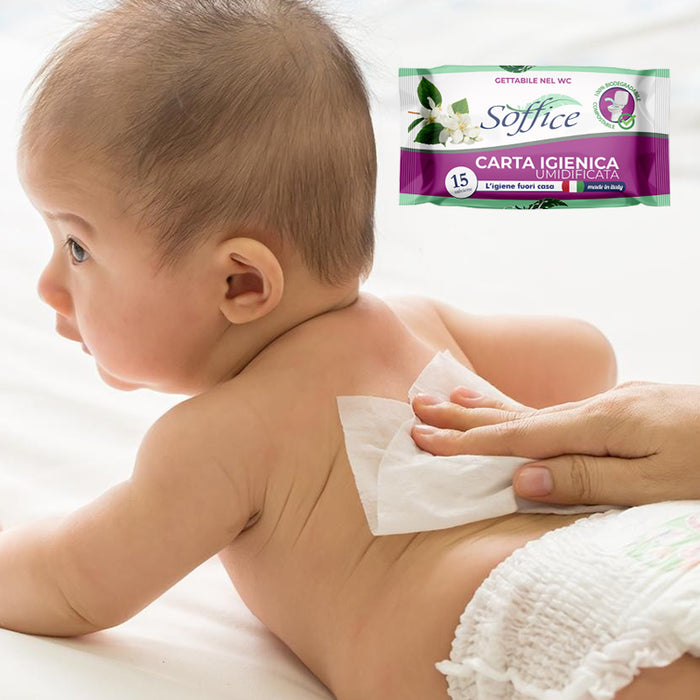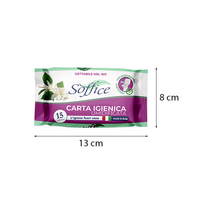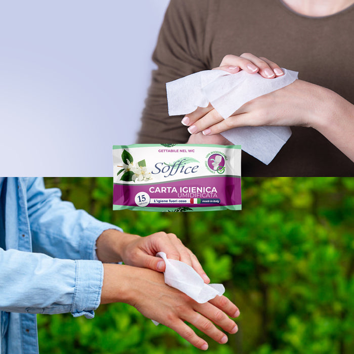 Salviette di Carta Igienica Umidificata confezioni da 15 pezzi ideali per l'igiene fuori casa, per la detersione delle parti intime ovunque ti trovi: in viaggio, in campeggio, nei bagni pubblici ecc. Pratiche e comode, da portare sempre con te!