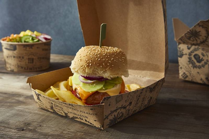 Linea Vintage - Hamburger box in carta + PE - Colore havana con stampa Vintage