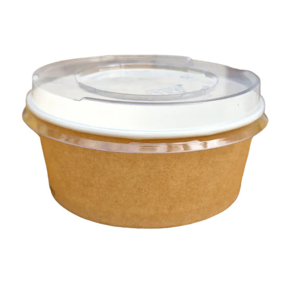 Contenitore da asporto con coperchio, in cartone kraft avana per alimenti. Perfetta come insalatiera, può contenere anche pasta o alimenti che unti grazie alla pellicola che al suo interno la rende antigrasso. Questo contenitore in cartone per consegne a domicilio di alimenti è impilabile, la confezione comprende sia la base che i coperchi.