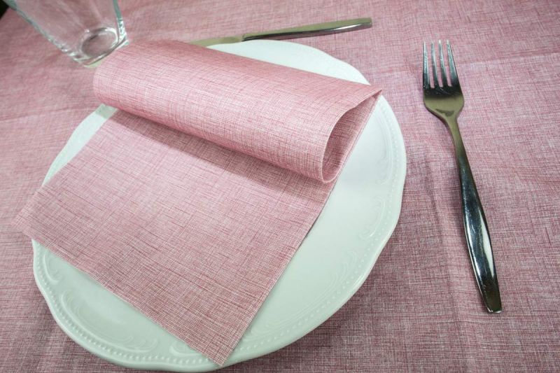 L’airlaid è un tessuto non tessuto privo di materie plastiche composto da fibre di cellulosa che vengono trattate con l’aria. In pratica tovaglie e tovaglioli in airlaid sono realizzati con carta a secco idonea al contatto con gli alimenti.