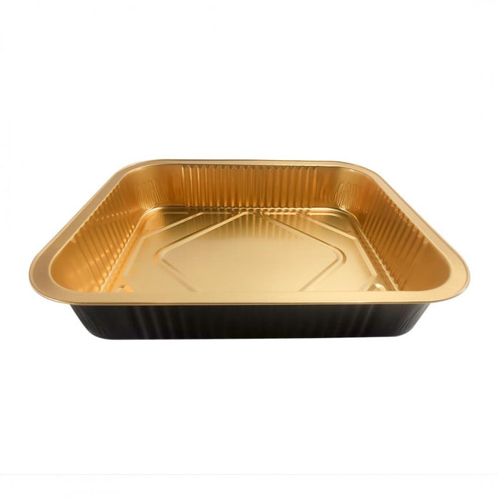 Vaschette rettangolari per otto porzioni molto eleganti in alluminio laccato sia all’esterno che all’interno. Sono nere fuori e oro dentro. Le vaschette Eclipse sono in alluminio laccato e sono quindi adatte a tutti i tipi di alimenti, anche quelli acidi o salati, ideali sia per cibi cotti o crudi, sia per cibi da cuocere. Le vaschette in alluminio Eclipse sono usa e getta e sono idonee all'utilizzo nei microonde (max 15 minuti), nei forni tradizionali (max 200°C) e in freezer (max -40°C). Possono contenere fino a otto porzioni.